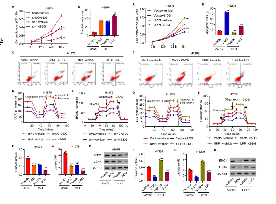④验证UPP1对2-DG诱导肿瘤进展的作用:UPP1干扰促进糖酵解抑制剂2-DG的抑癌作用;UPP1过表达则作用相反。